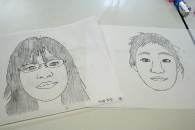 自分の顔ができたら、隣の人の写真もトレースして描いておく。今回は自分とぜんぜんちがうもう一人の顔の間をつなぐ制作をするぞ。