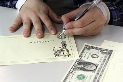 お札ってパッと見ただのグレイに見えるところも、よく観察すると複雑な模様の集まりである。各国の知恵と技術の集積。その国らしさが表れたデザイン。円もユーロもそう思って見るとすげもんだぞ。「らしさ」を表すとどうなるか、今週の授業では自分銀行券を発行する予定。ふっふっふっふ