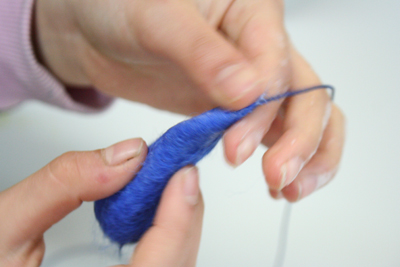 手の平のうえでヒツジの毛を揃えて、丸めて、なでてモジョモジョ、モジョモジョ…