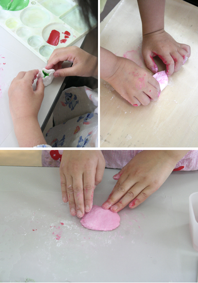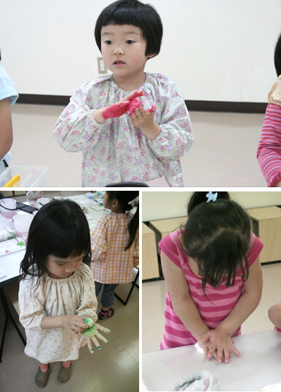 繪筆新聞にも書いたが、えふでは何年も前の授業で「紙粘土に絵の具を混ぜて、色粘土を作る」でキッズ惨敗!の経験をしておるのだ。ほぼ全員がマーブル模様。均一な色の粘土にするには、指先でちまちま練っててもだめ!体重をかけて粘土をつぶして、色の混ざり具合を見ながらたたみ込んで、擦り込んで…これができないんだな。