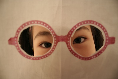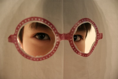 テントの中で遊んでるこどもをメガネの穴から観察中。