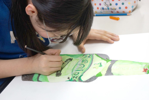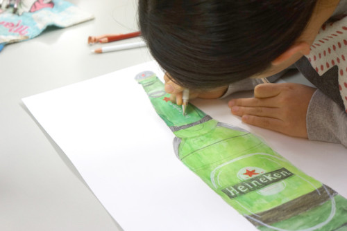 オランダのアムステルダムで生まれたハイネケンビール。かっこいいモチーフですが、透明なものをこどもたちはどのように描くのでしょう?「となりの人が映ってる」「びんの裏にもラベルがある」「でこぼこした文字がある」「くらいところ明るいところがある」・・・うーん描くところがたくさんありそう!