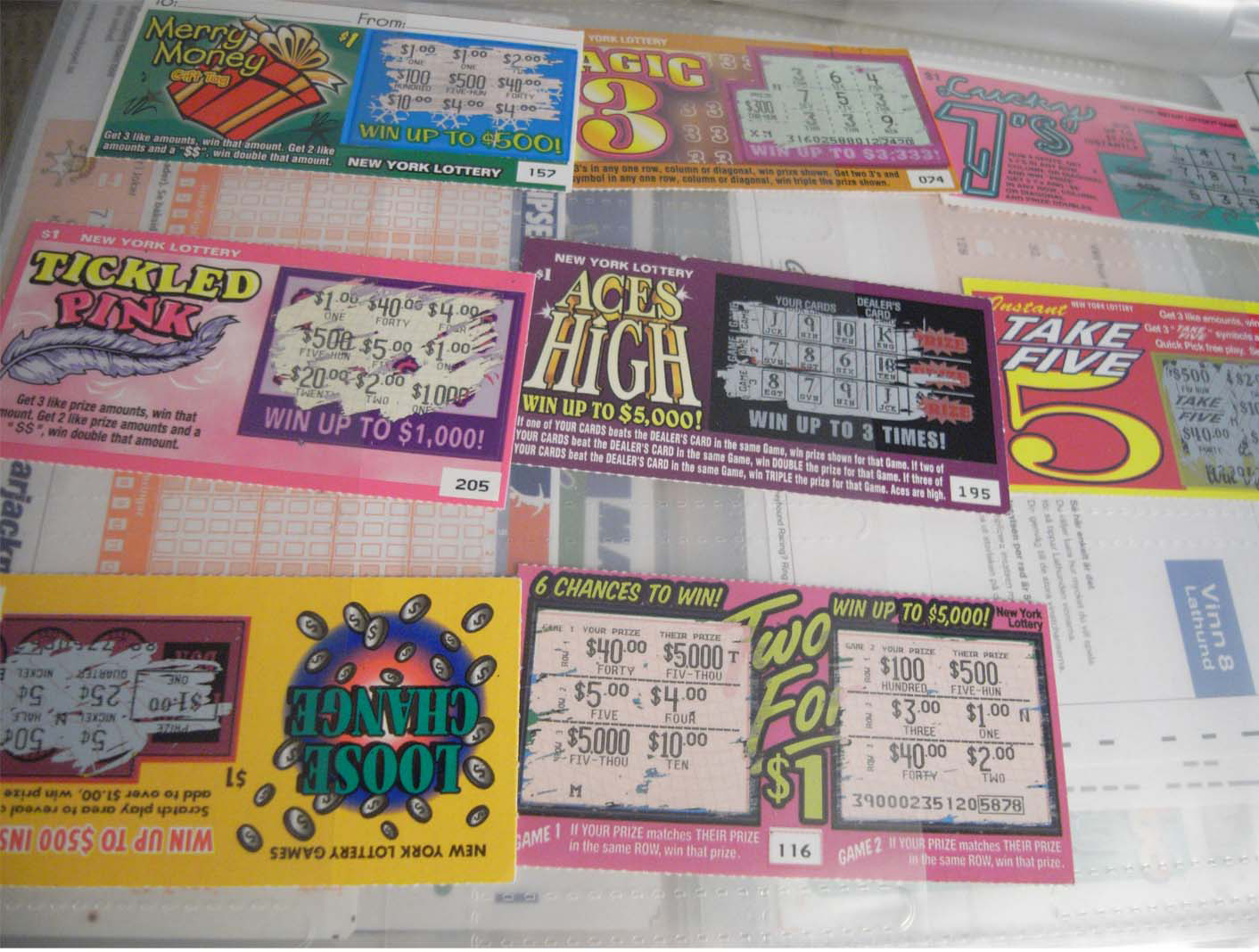 蚤の市とかで買うときもあります。世界中の宝くじとかロトくじとか。古本屋とかでまとめて手に入れたりもしています。