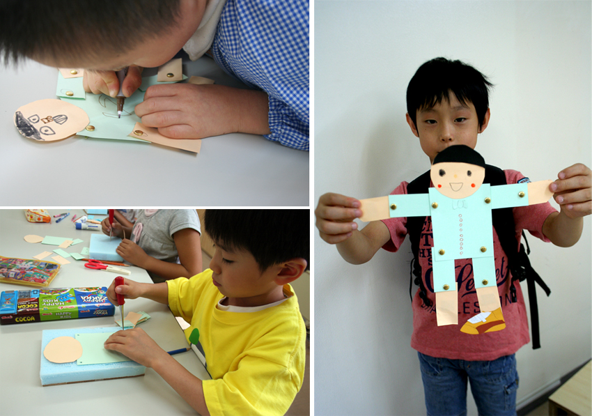 リベットで1点留めたら間接が動く。2点留めたら止まっちゃう…という仕組みの授業でした。