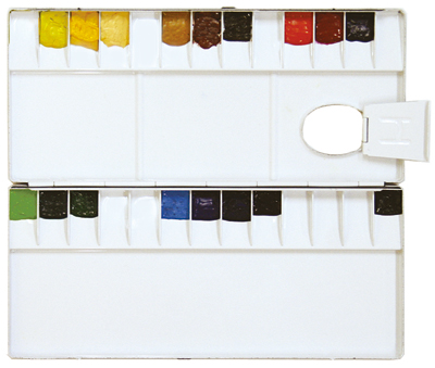 透明水彩絵の具(えふで絵の具)用におすすめしている、二つ折りのパレットです。 ●ターレンス |