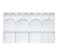 不透明水彩絵の具(がっこう絵の具)用におすすめしている1枚もののプラスチックパレット。各サイズの仕切りも多く使いやすいです。