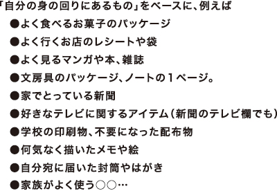 などなど、日常のものを10〜20種類ほど集めてくるのだ。よいか、賢いえふでっ子たちがまずはじめにするべきことは…これ専用の袋とか封筒とかを用意すること!まずは準備を整えてから収集スタートぞな。