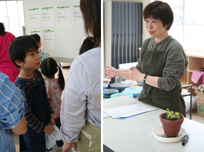 まずは何の野菜を植えるかを選ぶのだ。親子で参加のところは、やはりごはんを作るお母さんにひとこと相談。そりゃね、うまくいけば数ヶ月後の献立に登場するからの。そして何を隠そう今回指導をお願いした石神先生は、ぬぁんとえふでのママ部員!陶芸家であり、二児の母でもあるのです。キッズから大人まで、ファミリー色の強いこの講座。陶芸に関してはほぼ初心者揃いですがどうぞよろしくお願いします。