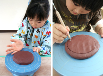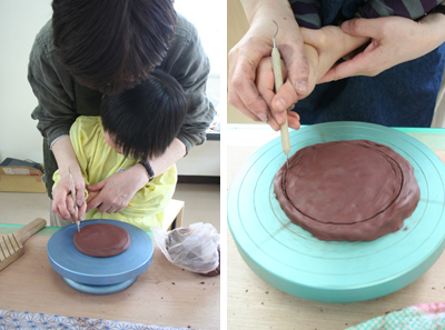 お!いっちょまえにろくろも登場。底になる部分を切り抜く。