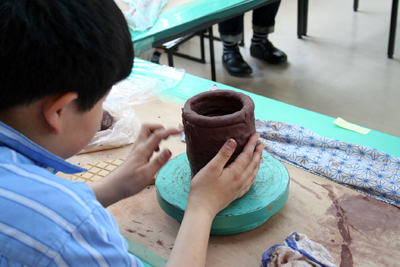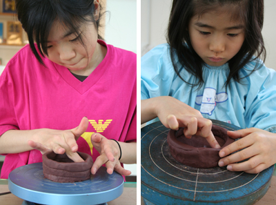 ろくろは回すが、手は固定。これができれば自然にきれいな円が描けるんだがの。ちんまい子どもにはやはりむずかしい。