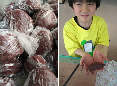 使う粘土はちょいと赤が強め。植木鉢にはぴったりぞな。まずはじめにさつまいものような形を手で作る。
