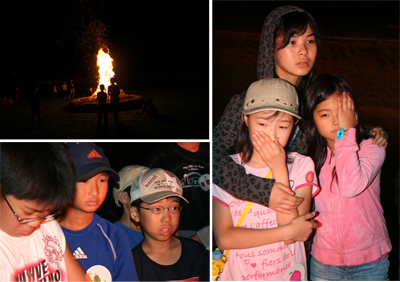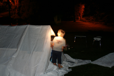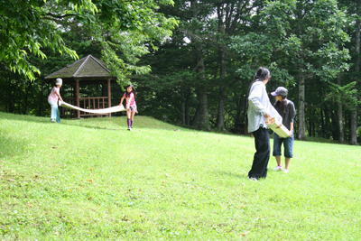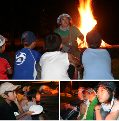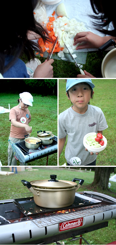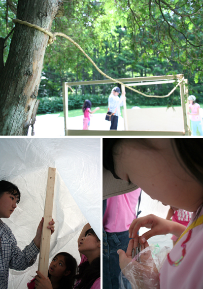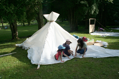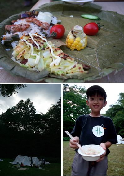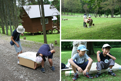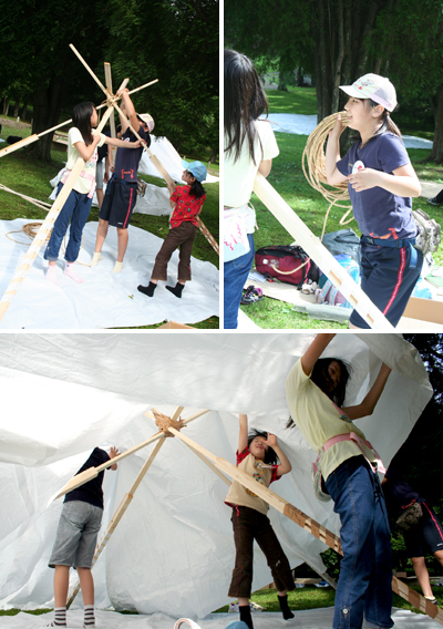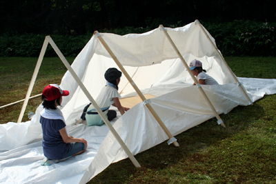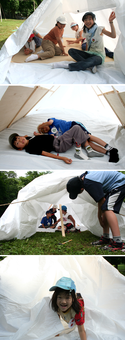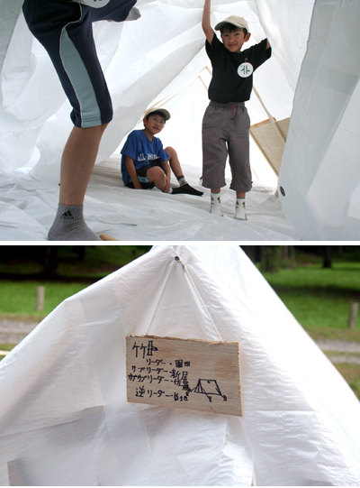難民キャンプ…ならぬ三匹のこぶたキャンプ。子どもたちが知恵と技術を集結させて作った白いテントは、普通のキャンパーにしてみると異様なものに映ったでしょう。しかし中の子どもたちにとってはまさに「自分たちの城」。穴が空こうが、草が出ようが、たくましく一夜を明かしたのでした。