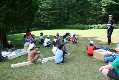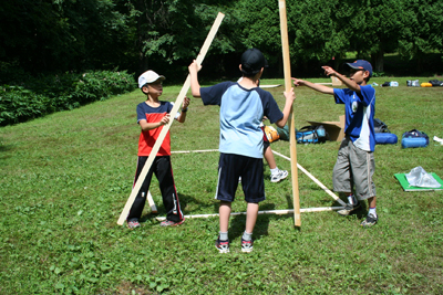 案の定、テントづくりが始まるととたんに元気を取り戻した子どもたち。そんな中、いきなり木材を組み立て始めたのは男子ばかりの松チームと竹チーム。