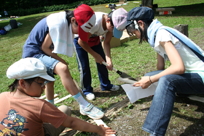 端っこに陣地を決めたチーム・桃。ここはプラン立てるのも時間がかかったが…4人中3人が昨年のキャンプの経験者。ていねいな仕事をみせる。