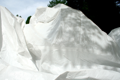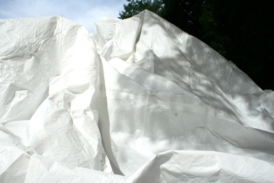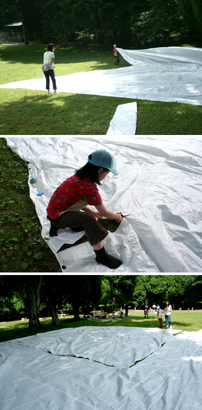 テント制作で意外と面倒なしごとのひとつがシートのカット。10m×10mもあると何せ重い。自由もきかないのだ。まずは広い場所に運んで全体を広げるところから。