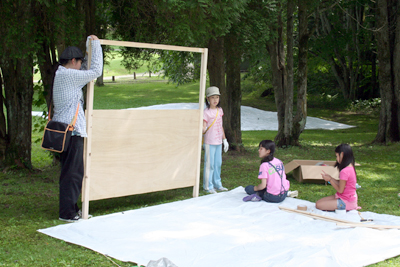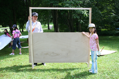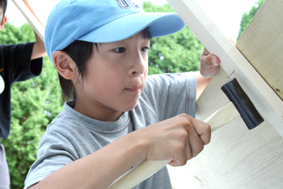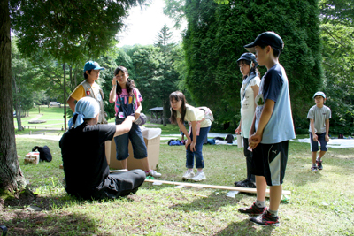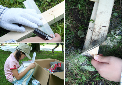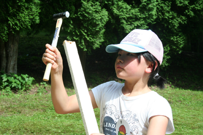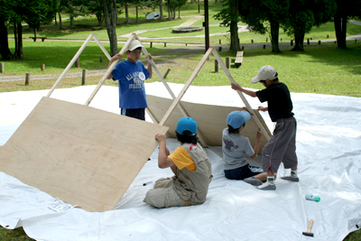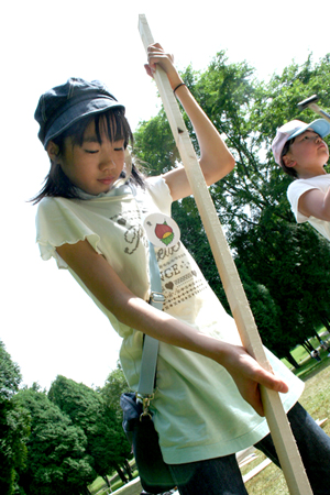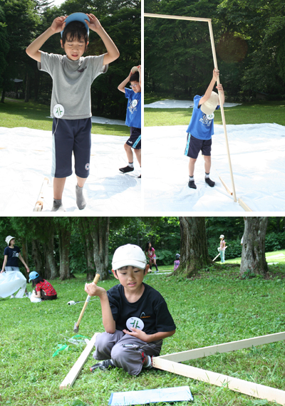 このチームは門型に組もうとした支柱がなかなか安定せず相当手こずっておった。ネジで留めようがテープで巻こうが、自立させるのは大変なのだ。しかも1m80cmの角材は、上から打ち込むなんてちんまい子どもたちには無理難題!前日のプランの上では自重のことなんか全くの想定外…暑さもありイライラが募る。