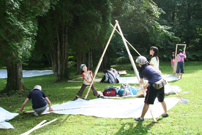 テントの作り方や食事の内容について、やんややんやと打合せをしてる間にバスはキャンプ場に到着。ここからさっそくテント作り!