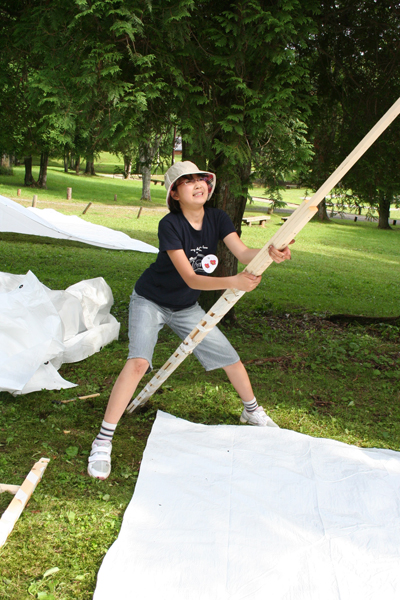 どうやら予定通りに事が進まず、あれこれやった挙げ句バッサリと見切りをつけたらしい。模型まで作って練りに練ったプランだが…ここで作戦変更したのはナイスな判断ぞな。残り時間もギリギリの中、テント制作の責任者・サブリーダーも俄然力を発揮しはじめる。