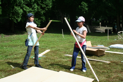 一方こちらのチームでは角材を組み合わせて、かなり丈夫な支柱を制作。「ふんぬーっ」お、重い…