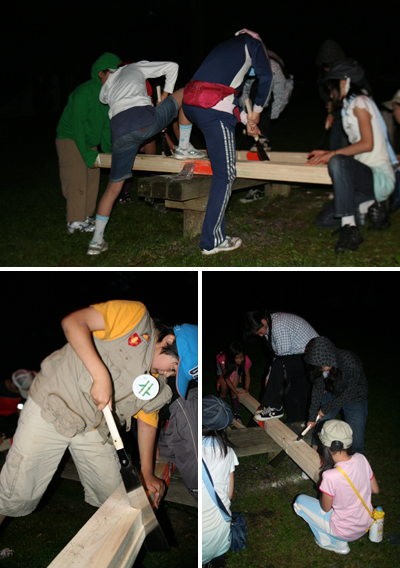 夜の森で予告なしに突然開催された『チーム対抗・木材早切り対決!』15本の角材を早く切り終えたチームが勝ちぞな!な、何かあるにちがいない…戸惑う隙もなく、スタートの合図とともにものすごい轟音が「ゴゴゴゴゴッ」ややや…のこぎりの音!みんな真剣ぞな…つーか目つきがやばい!