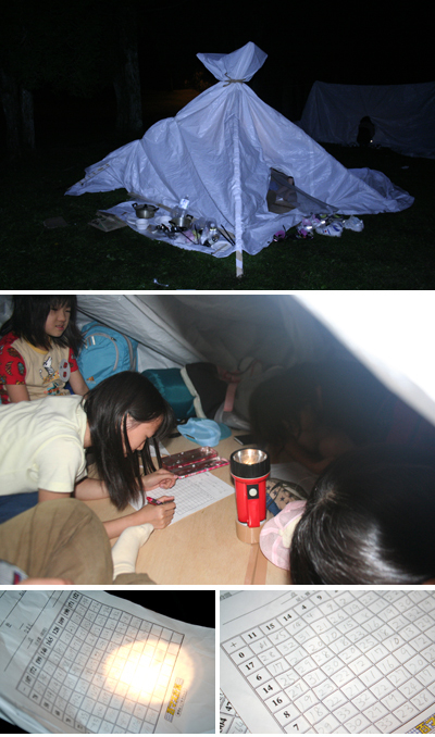 最下位だった梅チームには、最もつらい「百マス計算でございます。」テントに戻り、他のチームがすっかり就寝準備をした後も、狭いテントでひたすら計算…