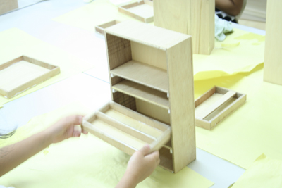 木のパーツを組み立てて…ぬぁんと棚まで作っとる!今回ばかりはキッズ最高学年の小2の子どもたちも目が本気。もちろん4歳児にも容赦ない。自分で組み立てる。