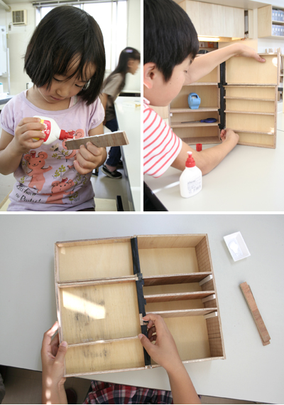 先週作った木箱はちゃんと扉が開閉するか?さらに中に入れるもの考えながら、足りない棚もつける。