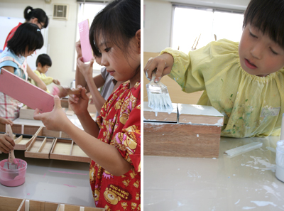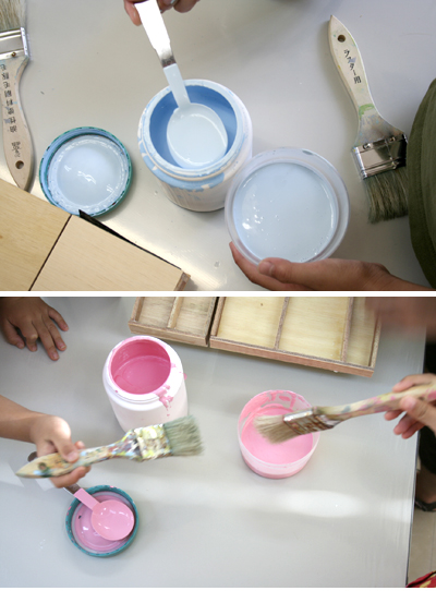 木材の組み立てが完成したら、冷蔵庫の色塗り。みんなが使う塗料を配布するのは高学年の子どもたちの役目。「早く」「きれいに」「たっぷりと」