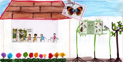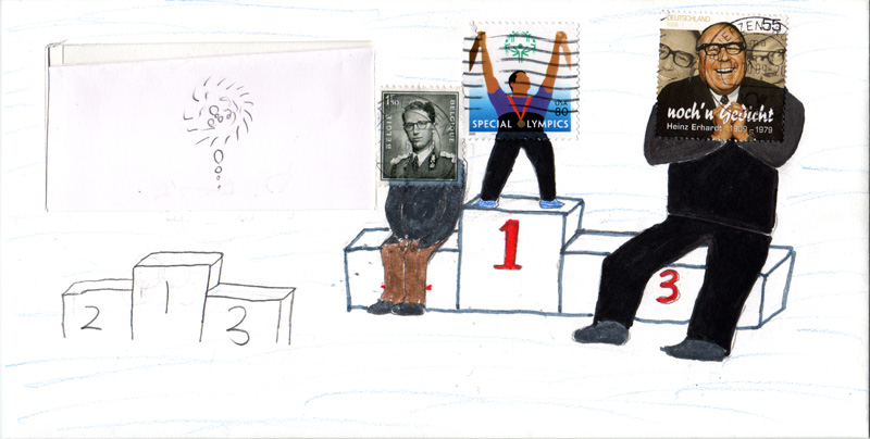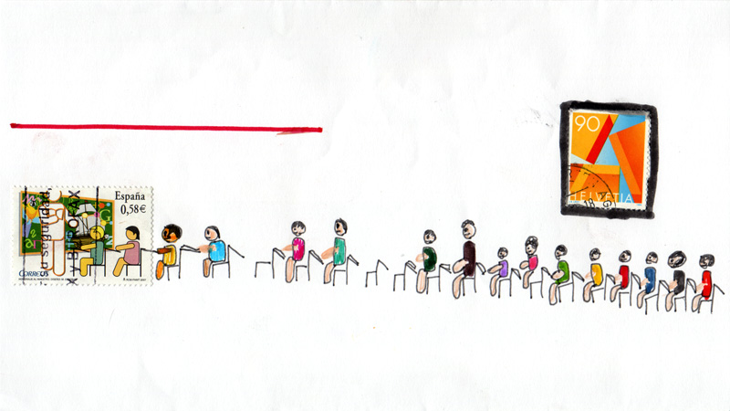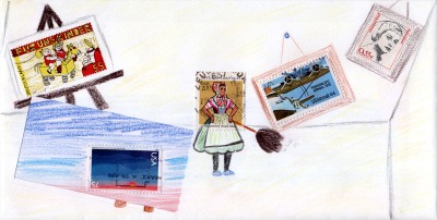 山のようにあるこれ!ドイツで仕入れてきた世界中の使用済み切手なのだ。使いたくてうずうずしながら寝かせてあったのだ。切手の絵をつなげたり、描き足すことで物語のある絵にするってわけ。