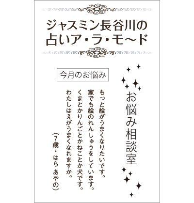 こちらはおなじみ西洋占星術・ジャスミン長谷川の占いア・ラ・モ〜ドもリニューアル。ジャスミン先生の「お悩み相談室」、みんなの悩みを聞いてくれるとな!ぬぁんとぜいたくな。