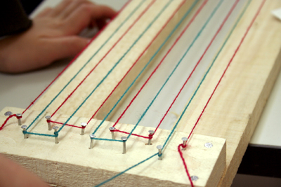 機織するために、まずは赤と青の縦糸張りから。