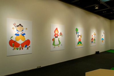 壁面には展覧会のメインビジュアルにも使った「こんがらがった主人公」。よく知っているはずの昔話が混ぜこぜになって、みんなの目を混乱させる…