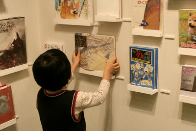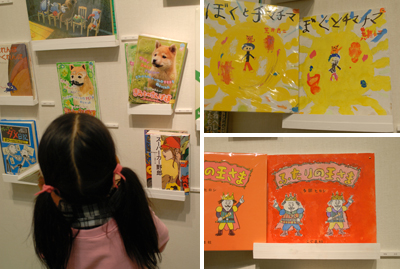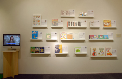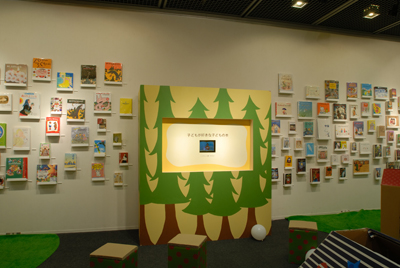 壁面の目玉はまほうの絵ふでの子どもたちが好きな子どもの本がずらり。おすすめの本についてインタビューした映像とともに楽しみました。