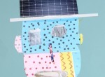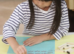 前回のプログラムでつくったいろいろな模様の紙を、画用紙にていねいに並べて貼る。白いところが見えちゃダメだぞ!ち…